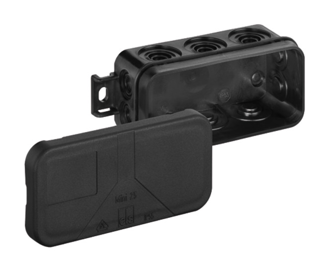 Verbindungsdose nach DIN EN 60670 (VDE 0606), 10 Einführungen, 2 Bodeneinführungen, geeignet für beengte Installationsumgebungen wie abgehängte Decken und Kabelkanäle, komplett mit Lochwerkzeug und Verschlussstopfen, mit außenliegenden Befestigungsstellen, schwarz, ohne Klemmen, für VDE-zugel. Einzelklemmen Verbindungsdose nach DIN EN 60670 (VDE 0606), 10 Einführungen, 2 Bodeneinführungen, geeignet für beengte Installationsumgebungen wie abgehängte Decken und Kabelkanäle, komplett mit Lochwerkzeug und Verschlussstopfen, mit außenliegenden Befestigungsstellen, mit Schutzart IP55, bis 2,5², mit Schutzgrad IK07, Schutzklasse II, VDE geprüft, Halogenfrei, x 89 x 37, schwarz, ohne Klemmen, für VDE-zugel. Einzelklemm