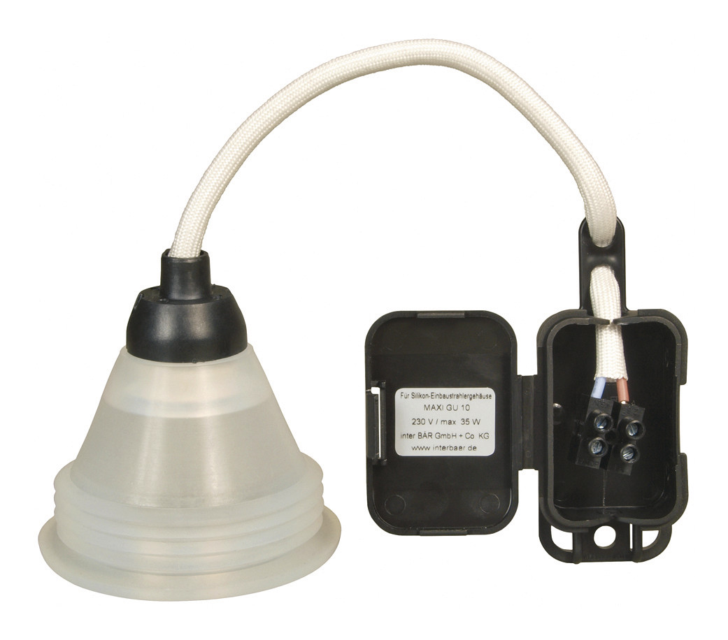 Silikon-Einbaustrahlergehäuse MAXI, Farbe: weiß Interbär Serie 1000, für Hochvolt-Halogen- und LED Leuchtmittel, UV-, Ozon- u. alterungsbeständig, für GU10 Halogenleuchtmittel D:51mm, 230V, 35W max oder GU10 230V LED Leuchtmittel bis 5W, Nur geeignet für Halogenleuchtmittel welche die Wärme nach vorne abstrahlen/abführen!, Keine COOL BEAM Leuchtmittel verwenden!, Einbaudurchmesser: 68mm, Einbautiefe: ca. 85mm mit Fassung, Außenmaße: D:79mm, Höhe: ca. 55mm (ohne Fassung)