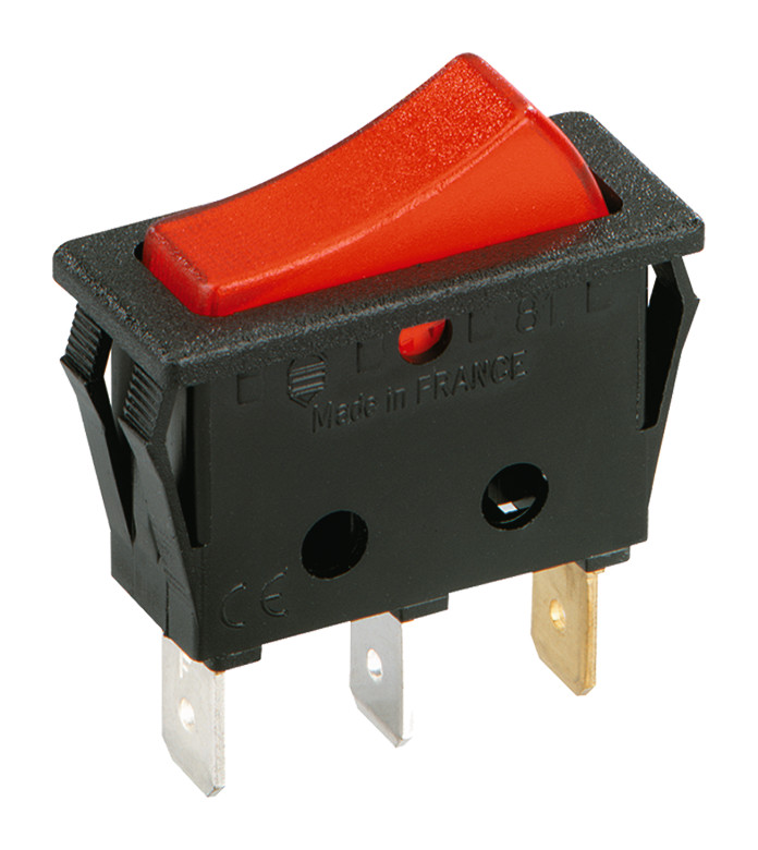 Wippenschalter Serie 3652 16(6) A 250V Ausschalter, 1polig, beleuchtet Gehäuse: schwarz / Wippe: rot Flachsteckanschlüsse 6,3 x 0,8 mm, Einrastbefestigung für Ausschnitt 11 x30 mm.| Hersteller / Marke | BACHMANN |