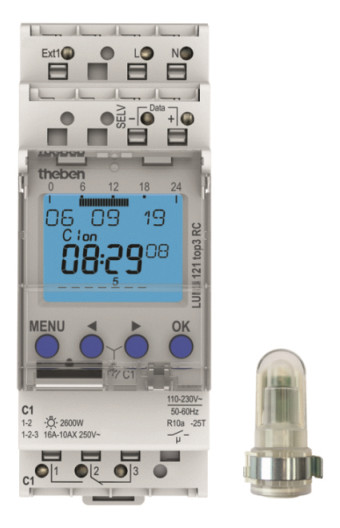 Digitaler Dämmerungsschalter/Lichtsteuergerät mit integrierter Zeitschaltuhr, 1 Kanal, Wochenprogramm, Separater Aufbau-Lichtsensor (IP 55) im Lieferumfang, DCF- oder GPS-Funksteuerung mit externer Antenne möglich, 1-99.000 lx, externer Eingang, 3 Sonderprogramme mit Jahresfunktion, Breite 2 TE, App-Programmierung möglich, Sichere Übertragung per optionalem Bluetooth Low Energy OBELISK top3, Maximale Manipulationssicherheit, Zeitschaltprogramme können nur dann von der App in die Uhr übertragen werden, wenn der Bluetooth OBELISK top3 in der Uhr steckt, 600 Watt LED-Leistung, 800 Ampere/200 Mikrosekunden Einschaltstrom, geringe Stand-by Leistung, Betriebsstundenzähler, DuoFix Steckklemmen, Gangreserve und programmierte Sommer-/Winterzeitumstellung, OBELISK-Schnittstelle für PC-Programmierung