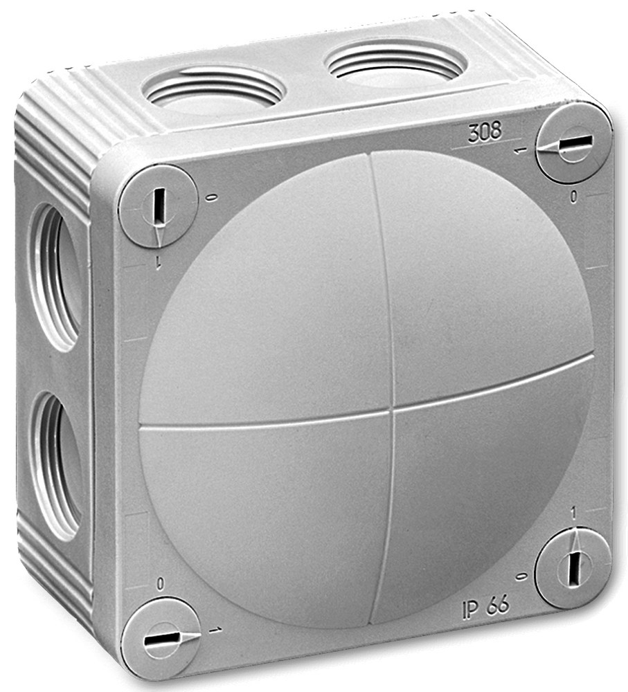 Material: Polypropylen, glasfaserverstärkt Dichtung: Thermoplastisches Elastomer Gehäuse aus zwei Komponenten (robustes Gehäuse und elastische Einführmembranen) Flammwidrig gemäß EN 60695-2-11 Halogenfrei Schlagfest und UV-beständig Typ 308, 407 und 607 integriertes Gewinde (keine Gegenmutter nötig) Typ 407, 607 und 1010 plombierbar Schutzart gemäß EN 60529 Schutzart: IP66; IP67 mit Verschraubungen Chemische Beständigkeit: beständig gegen Laugen und anorganische Säuren, Seewasser Spannungsrissgefahr: niedrig Temperaturbeständigkeit: -30°C bis +100°C, kurzzeitig bis ca. 120°C Installationstemperatur: -5°C bis +60°C Glühdrahtprüfung: 750°C Farbe: grau Befestigungsmöglichkeiten: Durch 4 innenliegende Öffnungen außerhalb des Dichtbereiches oder bei Typ 308 und 407 mit Schnellmontagebügel 4 unverlierbare Deckelschrauben Schraubklemmen 5-polig Typ 308: Klemme 2,5 mm², Kabeleinführung 8 seitlich, Membraneinführung, 400 V Typ 407: Klemme 4,0 mm², Kabeleinführung 7 seitlich +2 im Boden, Membraneinführung, 690 V Typ 607: Klemme 6 mm², Kabeleinführung 7 seitlich +3 im Boden, Membraneinführung, 690 V Typ 1010: Klemme 10mm², Kabeleinführung 10 seitlich +2 im Boden, mit Dichtung, 690 V Typ 1614: Klemme 10mm², Kabeleinführung 10 seitlich +4 im Boden, Membraneinführung, 690 V Mindestbestellmenge: 1 Stück
