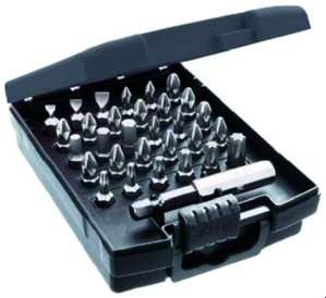 In ABS-Box, mit Standard Bits und Dauermagnethalter Material: Chrom-Vanadium-Stahl, durchgehend gehärtet Nach ISO 1173, DIN 3126, Form C6,3, 25 mm Länge Für Hand- und Maschinenbetrieb geeignet (Härtewerte (51-61HRC)) Inhalt: Schlitz 5,5 / 6,5 mm PH1 x 2 / PH2 x 4 / PH3, PZ1 x 2 / PZ2 x 4 / PZ3, TX T10 x 2 / T15 x 2 / T20 x 3 / T 25 x 3 / T30 x 3 / T40