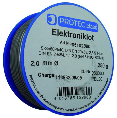 Flussmittelgefüllter, halogenhaltiger Weichlötdraht, bleihaltig Hohe Temperaturbeständigkeit Flussmittelrückstände rufen bei Nichteisenmetallen keine Korrosion hervor und können deshalb auf der Lötstelle verbleiben Flussmittel nach DIN EN 29454.1, 1.1.2.B bzw. DIN EN 61190-1-3, ROM1 Für Hand- und Maschinenlötungen Sn 60 Pb 40| Hersteller / Marke | PROTEC.CLASS |