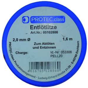 Mit halogenfreiem Flussmittel getränkte, extrem saugfähige Kupferlitze in praktischer Kunststoffrolle Anwendung: Die zu korrigierende Lötstelle bis zum flüssigen Zustand erhitzen, Entlötlitze solange zuführen bis das Lot aufgesaugt ist Farbe: rot Hinweis: Geschützt vor Feuchtigkeit lagern!| Hersteller / Marke | PROTEC.CLASS |