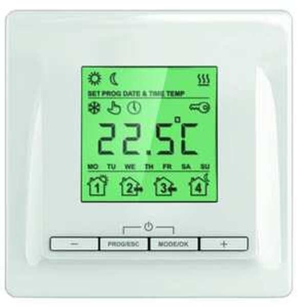 UP-Temperaturregler eignet sich für die Regelung elektrischer Fußbodenheizungssysteme Energiesparende und zuverlässige Regelung Wochenprogramm Einfache Bedienung Mit Frostschutzfunktion ausgestattet Schutzklasse: II Umgebungstemperaturbereich: +5°C bis +40°C Max. Luftfeuchte: 80 % Schutzgrad: IP21/IP31 Anschlussspannung: 230 VAC, 60 Hz Max. Strombelastung: 16 A Energiebedarf: 0,45 W Temperatureinstellbereich: +5°C bis +35°C Werkeinstellung: Comfort +28°C, Economy +22°C Farbe: weiß Fühler: NTC 6,8 kOhm Fühler Anschlussleitung: 2 m H: 35 mm