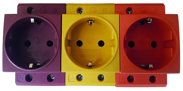 Schutzkontakt-Steckdose für die Montage auf DIN-Tragschienen, z. B. für Installations-Kleinverteiler und Zählerplätze gemäß VDE 0603 Steckdose für den Hausgebrauch und ähnliche Zwecke,VDE 0620, Teil 1 / 2005-04 Anzahl Klemmstellen: je 1 für L, N, PE Nennstrom: 16 A Nennspannung: 250 V Klemmkörper: Messing Klemmschrauben: Stahl, verzinkt Isoliergehäuse: Kunststoff, schlagzäh, flammgeschützt Leitungsanschluss:max. 10 mm² starr/mehrdrähtig Rahmenklemme mit integriertem Aderschutz Befestigung : Auf DIN Tragschiene nach EN 50022 / EN 60715 Umgebungstemperatur: -20°C bis +60°C Abmessungen: Hüllmaße entsprechend DIN 43880 „Automatenmaße“ Kappenmaß 45 mm, Breite 2,5 TE (<45mm) Schutzart: IP20, fingersicher Ausführung mit Deckel für Maßnahme Schutzisolation Ecken gerundet