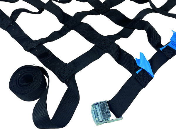 Pkw-Ladungssicherungsnetz aus Gurtband Material: PES-Gurtband Flächengewicht: 150 g/m² Maschenweite: ca. 100 x 100 mm Gurtband-Reißfestigkeit: bis 1.200 daN Gurtbandbreite: 25 mm LC: 200 daN Ausführung: - Losende angenähtes Gurtband 25 mm mit 1,50 m Länge- An allen 4 Ecken mit integriertem Klemmschloss Farbe: Schwarz