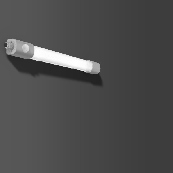 Feuchtraumleuchte mit schlanker und flacher Gehäuseform. Seitenteile Kunststoff (Polycarbonat) grau, schlagzäh. Diffusor Kunststoff (Polycarbonat) opal, schlagzäh. Diffusor extrudiert, innenprismatisch und UV-beständig. Lichtverteilung symmetrisch. Homogene Ausleuchtung. Rückwärtiger Lichtanteil zur Deckenaufhellung. Flexible Installation durch verschiebbare Montagebügel. Ideal bei Leuchtenaustausch. Deckenmontagebügel aus Edelstahl und Triangel-Bügel für Pendelmontage im Lieferumfang enthalten. Mit integriertem Bewegungsmelder. Betriebsgerät gekapselt, integriert und fest verbunden mit dem Diffusor und Seitenteil. Leuchte mit integrierter 4-poliger Durchgangsverdrahtung für das Aneinanderreihen von weiteren Leuchten. Komfortable Leitungseinführung über Kabelverschraubungen. Einfache Installation durch Drehverschluss auf beiden Seiten. Leuchten mit begrenzter Oberflächentemperatur nach DIN EN 60598-2-24 zur Verwendung in einer Umgebung, in der eine Ablagerung von leitfähigem Staub auf der Leuchte erwartet werden kann. Geeignet für den Einsatz in der Lebensmittel- und Getränkeindustrie.