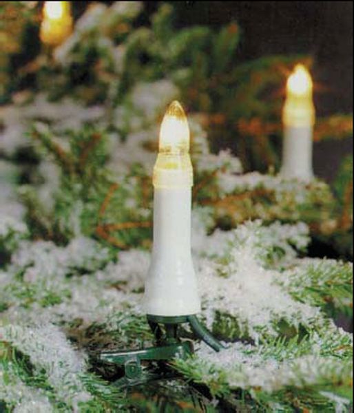 Top-Kerzen, geriffelt, Klammern mit Kugelgelenk, teilbarer Stecker, VDE-Prüfzeichen, Anschluss an 230 V ohne Trafo, Verbrauch: 25-teilig 75 W, Schaft weiß, grünes Kabel, Kerzenhöhe: 95 mm, Zuleitung: 160 cm 35-teilig, Länge: 2380 cm, Kerzenabstand: 70 cm