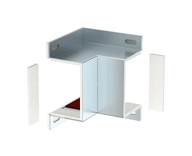 Formteil-Haube zur Abdeckung von zwei Kanalenden BSKM 0711 als Inneneck bei direkter Wand- und Deckenmontage. Inklusive eingeklebter Dichtungen zum Abdichten der Fugen und losen Dichtungen bei Kombination mit Gegenplatte, sowie Schrauben für den Potentialausgleich.