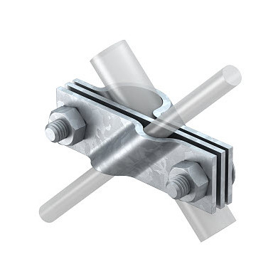 Anschlussschelle passend zum Anschluss von Tiefenerder Rd16 auf Rundleiter Rd 8-10 bzw. Flachleiter bis FL40, Mit Zwischenplatte, Montiert mit 2 Flachrundschrauben M10 x 30 und 2 Sechskantmuttern M10| Manufacturer / Brand | BETTERMANN |
