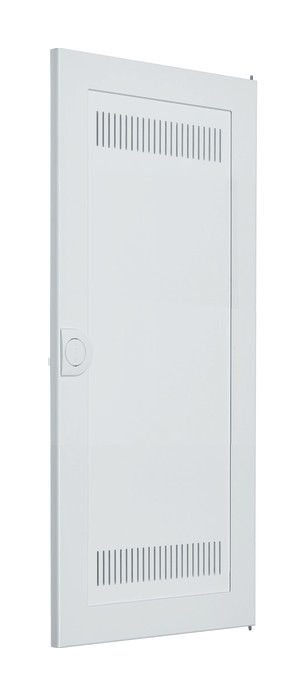 Tür, volta, Kunststoff, geschlitzt für UP- und Hohlwandverteiler, 3-reihig, IP30. Volta Tür mit außen verlaufendem Stahlblech pulverbeschichtet und eingebrannt mit zentrierten weißen undurchsichtigem dem Rahmen angepassten Kunststoff geschlitzt. Die Tür ist frontbündig einbaubar mit innenliegenden handbedienbaren Scharnieren. Der Türverschluss hat eine frontbündige Griffmulde mit selbsttätig zurückklappendem Griff. Ohne zusätzliche Demontage des Blendrahmens kann der Türanschlag rechts oder links gewählt werden. Die Schlitze in der Tür sind zur besseren Wärmeableitung der eingebauten W-LAN Komponenten.| Manufacturer / Brand | HAGER |