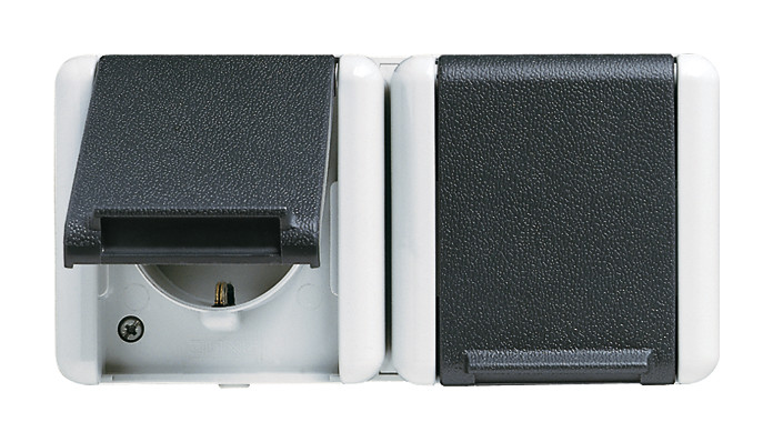 SCHUKO-Steckdose, 2fach, 16 A, 250 V ~, verdrahtet, 4 Leitungseinführungen, 2 Einzelabdeckungen, Abmessungen (B x H x T): 151 x 75 x 58 mm, für waagerechte Montage| Manufacturer / Brand | JUNG |