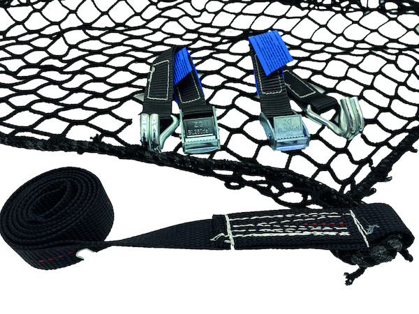 Mit verstärkter Randkordel mit angenähten Losenden (1,50 m und 1,00 m), 2 Karabinerhaken 8 x 80 mm aus verzinktem Stahl und 2 Festenden (Klemmschloss und Spitzhaken) Maschenweite: 30 mm, Kordelstärke: 3 mm Belastbarkeit LC: 200 daN, maximal zulässige Zurrkraft je Festende von 125 daN