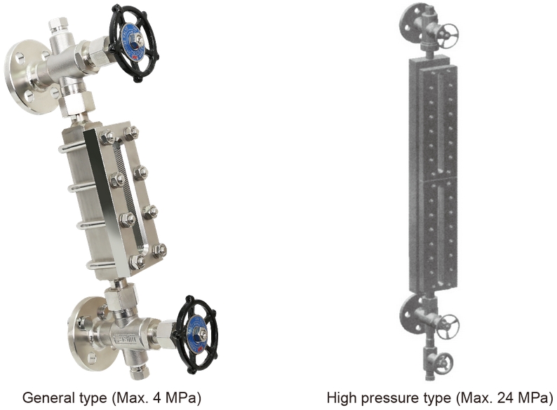 Reflex liquid level gauge has a sturdily constructed body- with the glass and cover securely held by U-bolts to maintain a hermetic seal (see figure below). This type of level gauge features several parallel grooves cut into the glass surface that is in contact with the liauid. The resulting prismatic diffraction gases to appear white by reflection: liquids black by absorption Thus the level of even fransparent liquids can be clearly observed.