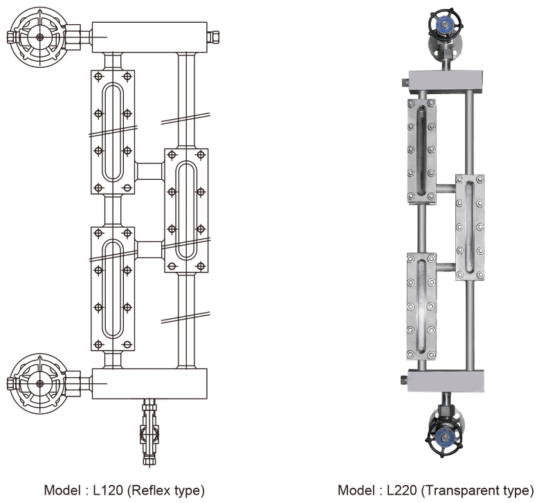 NON-FROSTING TYPE LIQUID LEVEL GAUGE is used for protection from the frost. Reflex type & Transparent type are provided Material- application method- gauge valve are entirely same to general use. Generally- for low temperature liquid to be used for refrigerator- the whole surface of liquid level body & cover are fristed- general liquid level body & cover are frosted- general liquid level gauges is covered with heavy frost and glass surface is entirely invisible. For the sake of this- non-frosting liquid level gauges is provided with methacrylate trans parent plate which has high level. So this crosses frosting strata or keeping cool materials- is easily visible the liquid level position clearly. H dimension of lift table- please designate applicable for working temperature or thickness of keeping cool materials
