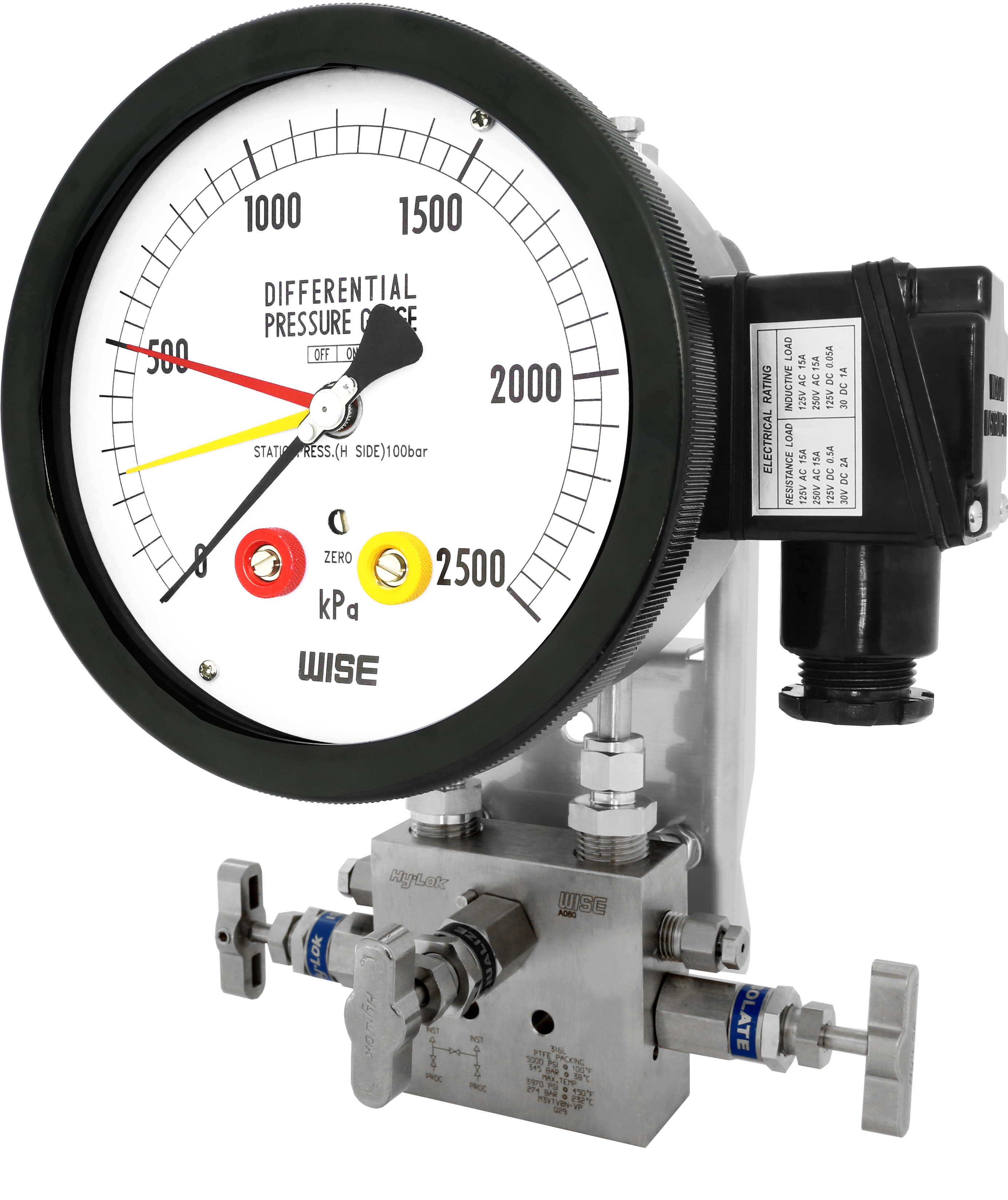 P680 series are differential pressure gauge is designed to measure differential pressure from 25 kPa to 2.0 MPa at static pressure 10 MPa. A set of two stainless steel bellows mounted on a force balance allows direct reading of the actual differential pressure. The contacts uses a reed switch for warning and control applications.
