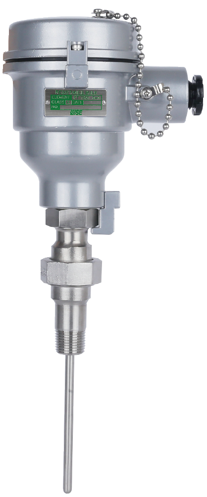 Generally, sheathed type temperature sensors are used with thermowell. To maximize the heat-transfer between sheath junction and thermowell, the sheath must be inserted as close as possible to the bottom of the well. However, it is not always possible to determine the actual distance between the end tip of the sheath and the bottom of the thermowell. Furthemore, heat expansion can damage the sheath which is located inside the thermowell. To prevent this uncertainty and the damage to the sheath, RS series employ the spring load type sheath. This spring load absorbs the impact to the sheath, and protects the sheath from the vibration. Moreover, it is designed to be used in an explosive area.