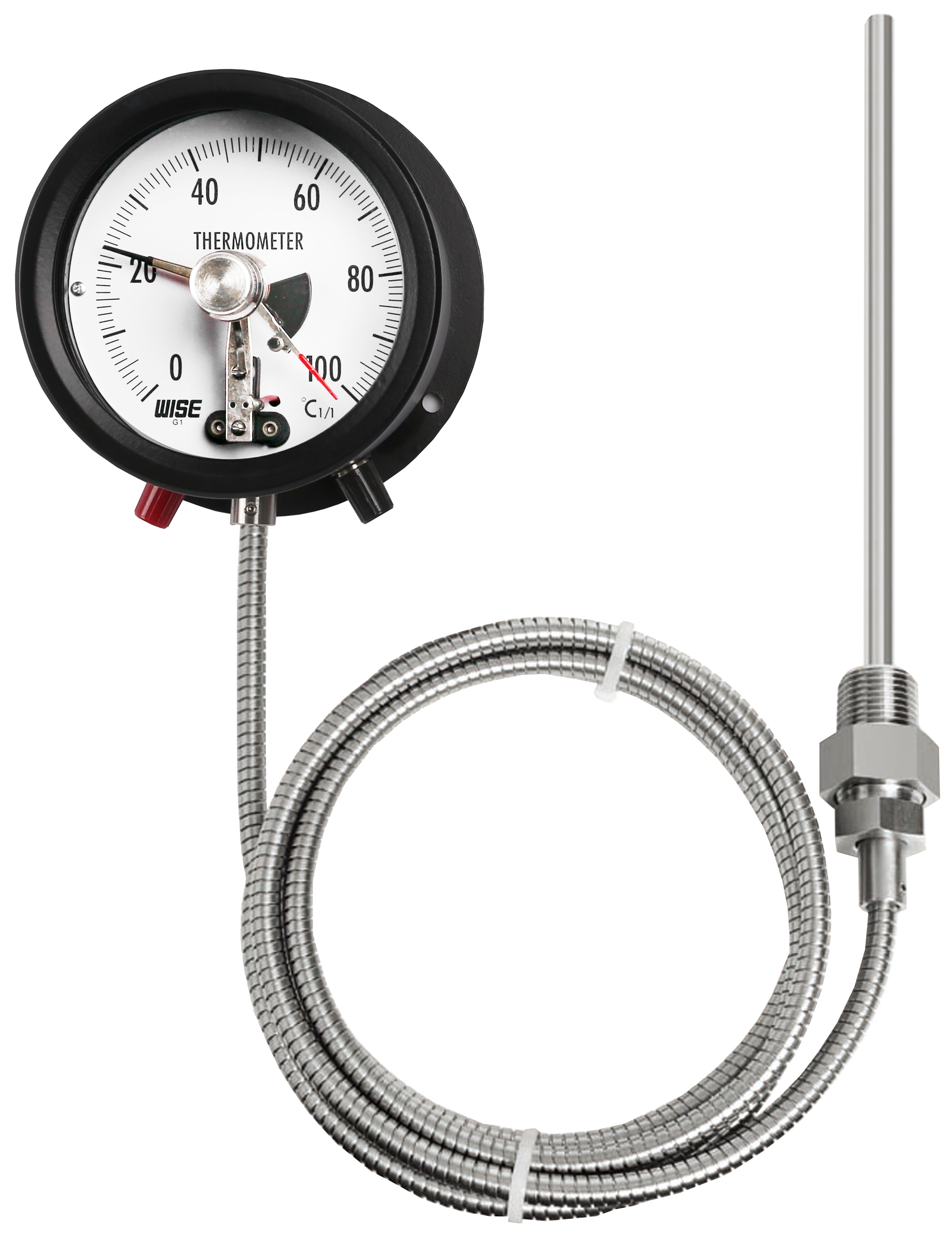 Contact type temperature gauge is installed with electric contact actuated by pointer. It provides the function which electrical circuit can be opened or closed by manual setpoint. It is applicable where signal is required (Audible or visual alarm) for control of resistance or any other application with auxiliary relay and contact.