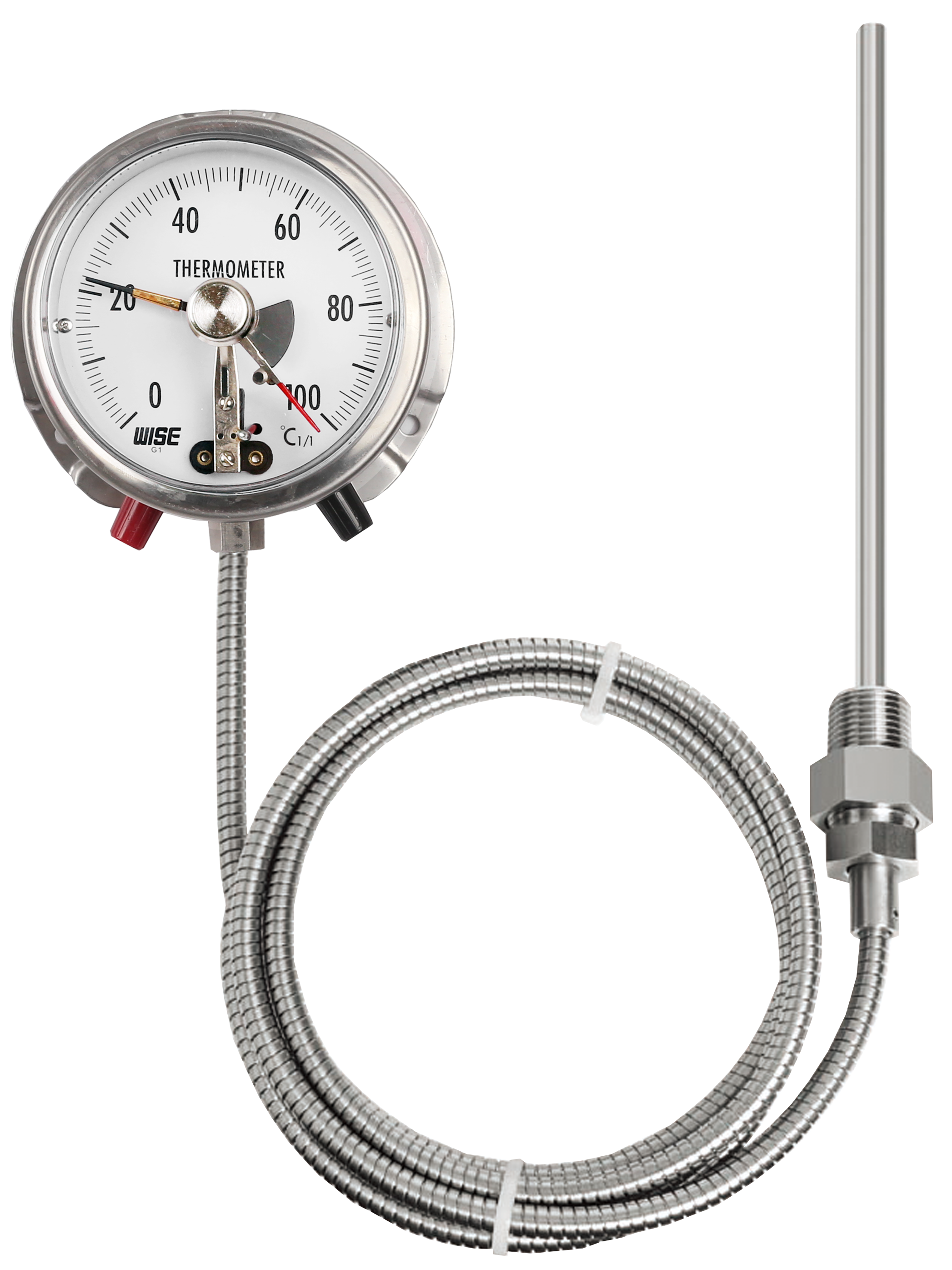 Contact type temperature gauge is installed with electrical contact actuated by pointer. It provides the function which electrical circuit can be opened or closed by manual setpoint. It is applicable where signal is required (Audible or visual alarm) for control of resistance or any other application with auxiliary relay and contact.